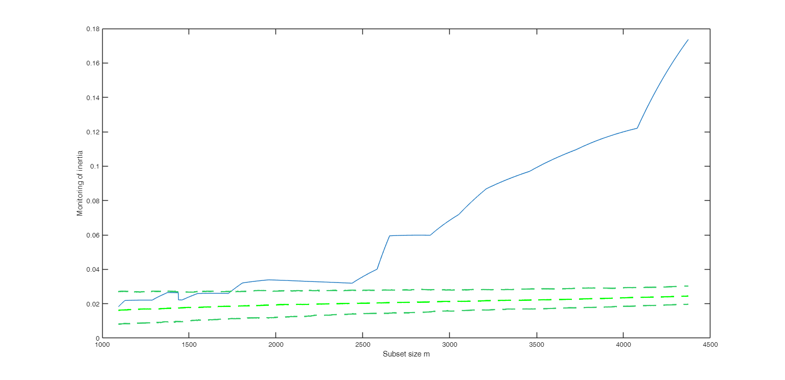 Total estimated time to complete MCD: 0.18 seconds Finding empirical bands Creating empirical confidence band for minimum (weighted) Mahalanobis distance Warning: interchange greater than 1 when m=1519 Number of units which entered=3 Warning: interchange greater than 1 when m=1094 Number of units which entered=3 Warning: interchange greater than 1 when m=1096 Number of units which entered=3 Warning: interchange greater than 1 when m=1098 Number of units which entered=3 Warning: interchange greater than 1 when m=1100 Number of units which entered=3 Warning: interchange greater than 1 when m=1102 Number of units which entered=3 Warning: interchange greater than 1 when m=1124 Number of units which entered=3 Warning: interchange greater than 1 when m=1126 Number of units which entered=3 Warning: interchange greater than 1 when m=1128 Number of units which entered=3 Warning: interchange greater than 1 when m=1130 Number of units which entered=3 Warning: interchange greater than 1 when m=1132 Number of units which entered=3 Warning: interchange greater than 1 when m=1134 Number of units which entered=3 Warning: interchange greater than 1 when m=1136 Number of units which entered=3 Warning: interchange greater than 1 when m=1138 Number of units which entered=3 Warning: interchange greater than 1 when m=1140 Number of units which entered=3 Warning: interchange greater than 1 when m=1142 Number of units which entered=3 Warning: interchange greater than 1 when m=1144 Number of units which entered=3 Warning: interchange greater than 1 when m=1146 Number of units which entered=3 Warning: interchange greater than 1 when m=1148 Number of units which entered=3 Warning: interchange greater than 1 when m=1150 Number of units which entered=3 Warning: interchange greater than 1 when m=1152 Number of units which entered=3 Warning: interchange greater than 1 when m=1154 Number of units which entered=3 Warning: interchange greater than 1 when m=1156 Number of units which entered=3 Warning: interchange greater than 1 when m=1158 Number of units which entered=3 Warning: interchange greater than 1 when m=1176 Number of units which entered=3 Warning: interchange greater than 1 when m=1178 Number of units which entered=3 Warning: interchange greater than 1 when m=1180 Number of units which entered=3 Warning: interchange greater than 1 when m=1182 Number of units which entered=3 Warning: interchange greater than 1 when m=1184 Number of units which entered=3 Warning: interchange greater than 1 when m=1186 Number of units which entered=3 Warning: interchange greater than 1 when m=1188 Number of units which entered=3 Warning: interchange greater than 1 when m=1190 Number of units which entered=3 Warning: interchange greater than 1 when m=1192 Number of units which entered=3 Warning: interchange greater than 1 when m=1194 Number of units which entered=3 Warning: interchange greater than 1 when m=1196 Number of units which entered=3 Warning: interchange greater than 1 when m=1198 Number of units which entered=3 Warning: interchange greater than 1 when m=1200 Number of units which entered=3 Warning: interchange greater than 1 when m=1202 Number of units which entered=3 Warning: interchange greater than 1 when m=1204 Number of units which entered=3 Warning: interchange greater than 1 when m=1206 Number of units which entered=3 Warning: interchange greater than 1 when m=1208 Number of units which entered=3 Warning: interchange greater than 1 when m=1210 Number of units which entered=3 Warning: interchange greater than 1 when m=1212 Number of units which entered=3 Warning: interchange greater than 1 when m=1214 Number of units which entered=3 Warning: interchange greater than 1 when m=1216 Number of units which entered=3 Warning: interchange greater than 1 when m=1746 Number of units which entered=3 Warning: interchange greater than 1 when m=1748 Number of units which entered=3 Warning: interchange greater than 1 when m=1750 Number of units which entered=3 Warning: interchange greater than 1 when m=1752 Number of units which entered=3 Warning: interchange greater than 1 when m=1754 Number of units which entered=3 Warning: interchange greater than 1 when m=1756 Number of units which entered=3 Warning: interchange greater than 1 when m=1758 Number of units which entered=3 Warning: interchange greater than 1 when m=1760 Number of units which entered=3 Warning: interchange greater than 1 when m=1762 Number of units which entered=3 Warning: interchange greater than 1 when m=1764 Number of units which entered=3 Warning: interchange greater than 1 when m=1766 Number of units which entered=3 Warning: interchange greater than 1 when m=1768 Number of units which entered=3 Warning: interchange greater than 1 when m=1770 Number of units which entered=3 Warning: interchange greater than 1 when m=1772 Number of units which entered=3 Warning: interchange greater than 1 when m=1774 Number of units which entered=3 Warning: interchange greater than 1 when m=1776 Number of units which entered=3 Warning: interchange greater than 1 when m=1778 Number of units which entered=3 Warning: interchange greater than 1 when m=1780 Number of units which entered=3 Warning: interchange greater than 1 when m=1782 Number of units which entered=3 Warning: interchange greater than 1 when m=1784 Number of units which entered=3 Warning: interchange greater than 1 when m=1786 Number of units which entered=3 Warning: interchange greater than 1 when m=1788 Number of units which entered=3 Warning: interchange greater than 1 when m=1790 Number of units which entered=3 Warning: interchange greater than 1 when m=1792 Number of units which entered=3 Warning: interchange greater than 1 when m=1794 Number of units which entered=3 Warning: interchange greater than 1 when m=1796 Number of units which entered=3 Warning: interchange greater than 1 when m=1798 Number of units which entered=3 Warning: interchange greater than 1 when m=1800 Number of units which entered=3 Warnin