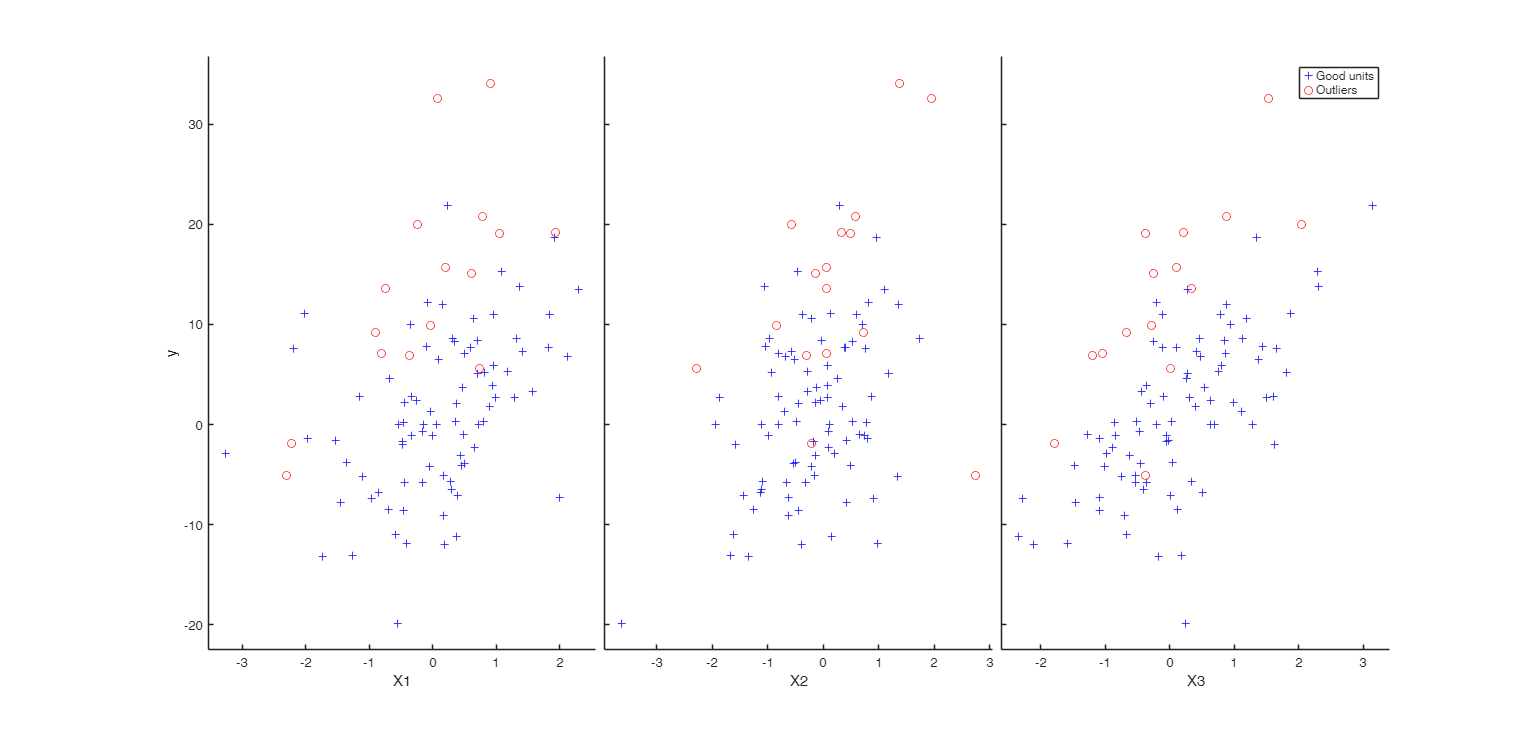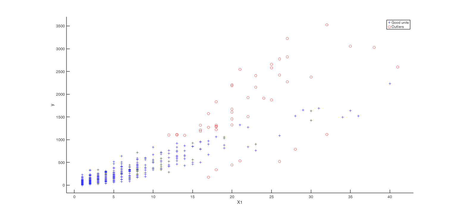 If the design matrix X contains several high leverage units (that is units which are very far from the bulk of the data), it may happen that the best subset of LXS may include some of these units, or it may happen that these units have a deletion residual which is very small due to their extremely high value of $h_i$. bonflevoutX=1 imposes the constraints that: 1) the extracted subsets which contain at least one unit declared as outlier in the X space by FSM using a Bonferronized confidence level of 0.99 are removed from the list of candidate subsets to find the LXS solution.