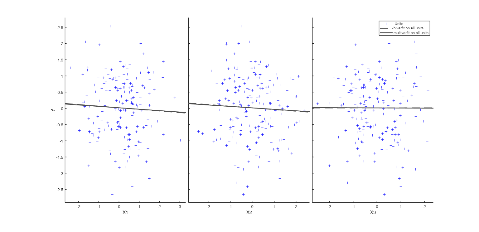 bivarfit = '1' fits a single ols line to all points of each bivariate plot in the scatter matrix y|X.