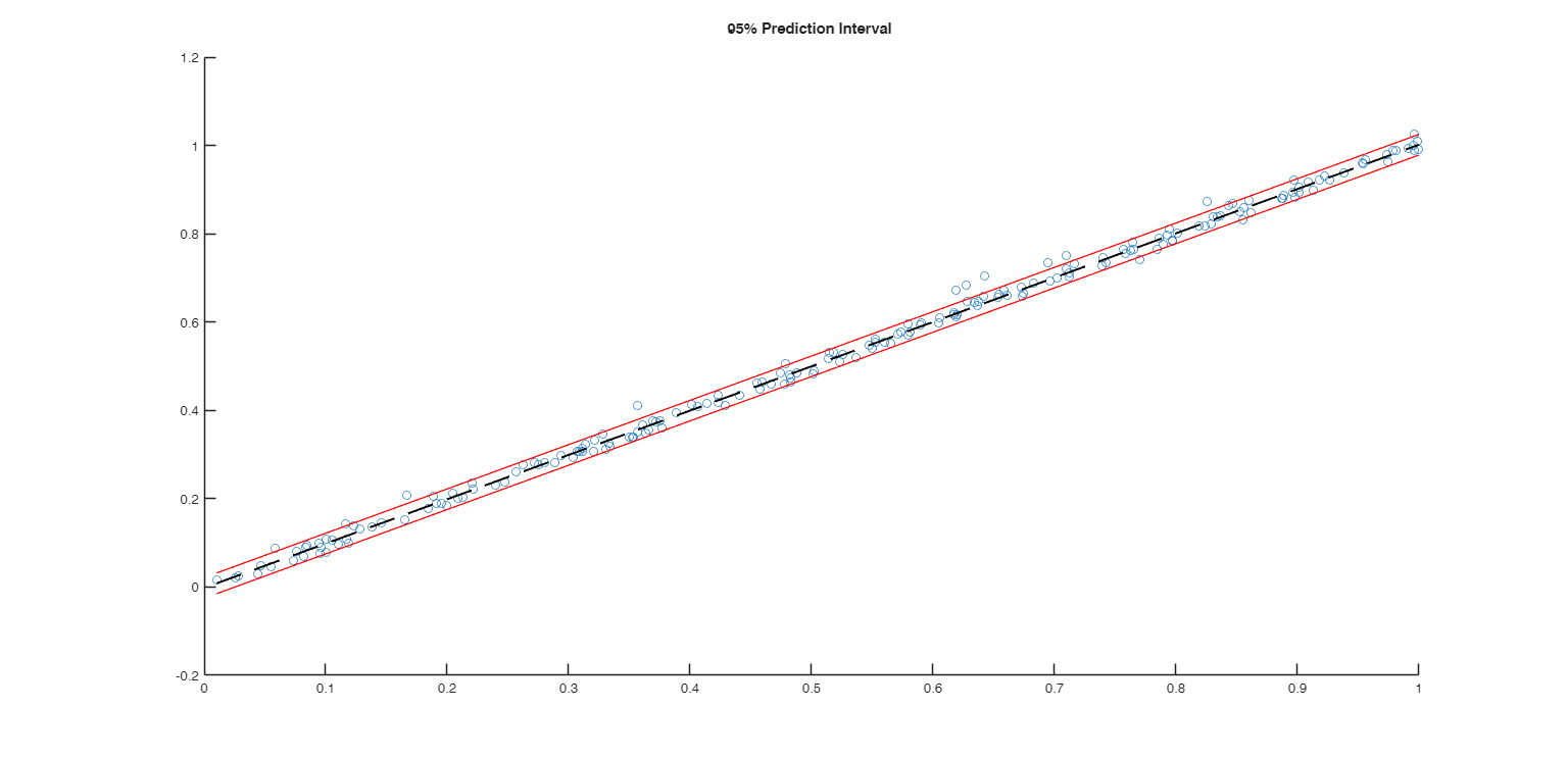 —Plot of prediction intervals.scalar.If plotsPI =1 and the number of regressors (excluding the constant term) is equal 1, it is possible to see on the screen the yX scatter with superimposed the prediction intervals using a confidence level 1-alpha, else no plot is shown on the screen.