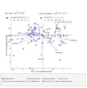 —show regression graphically.boolean.If plots is true an additional plot which shows the (x,y) data, the fitted regression line and the residuals is shown on the screen. Clicking on the line in the legend it is possible to show/hide these three components.