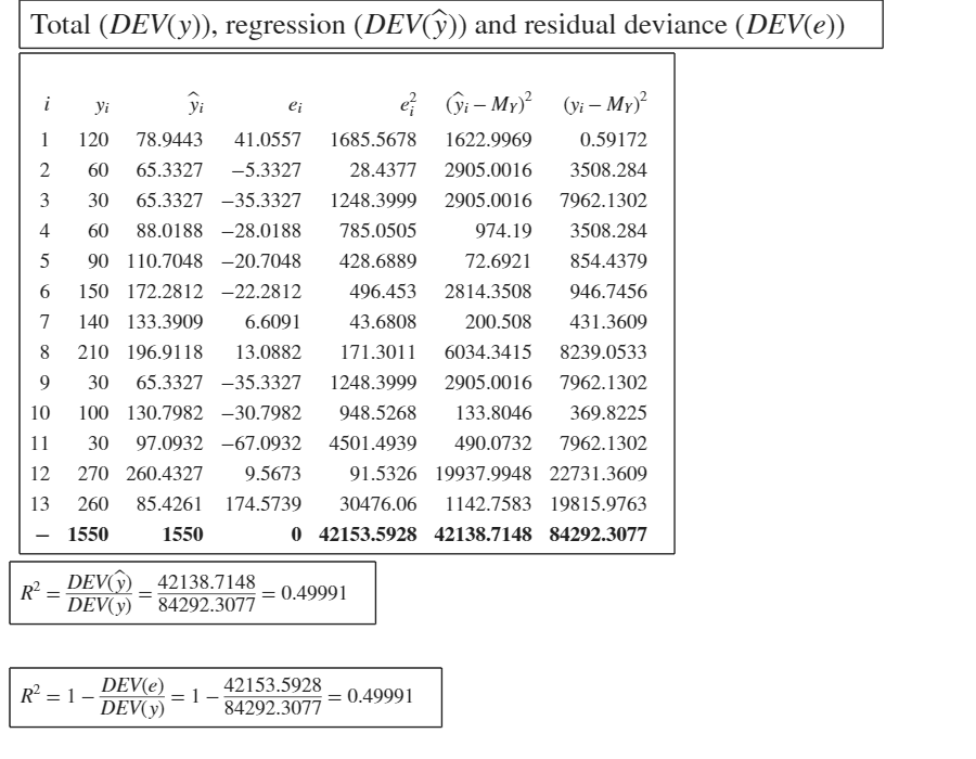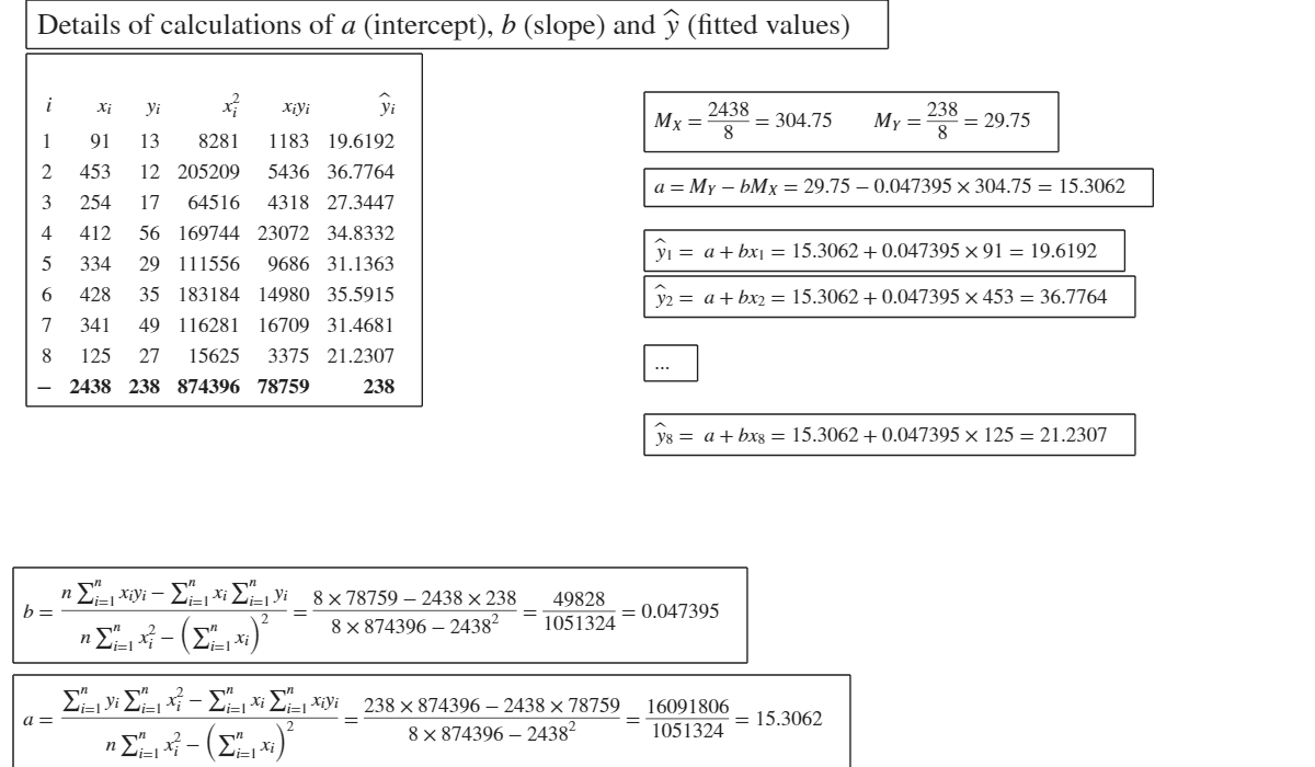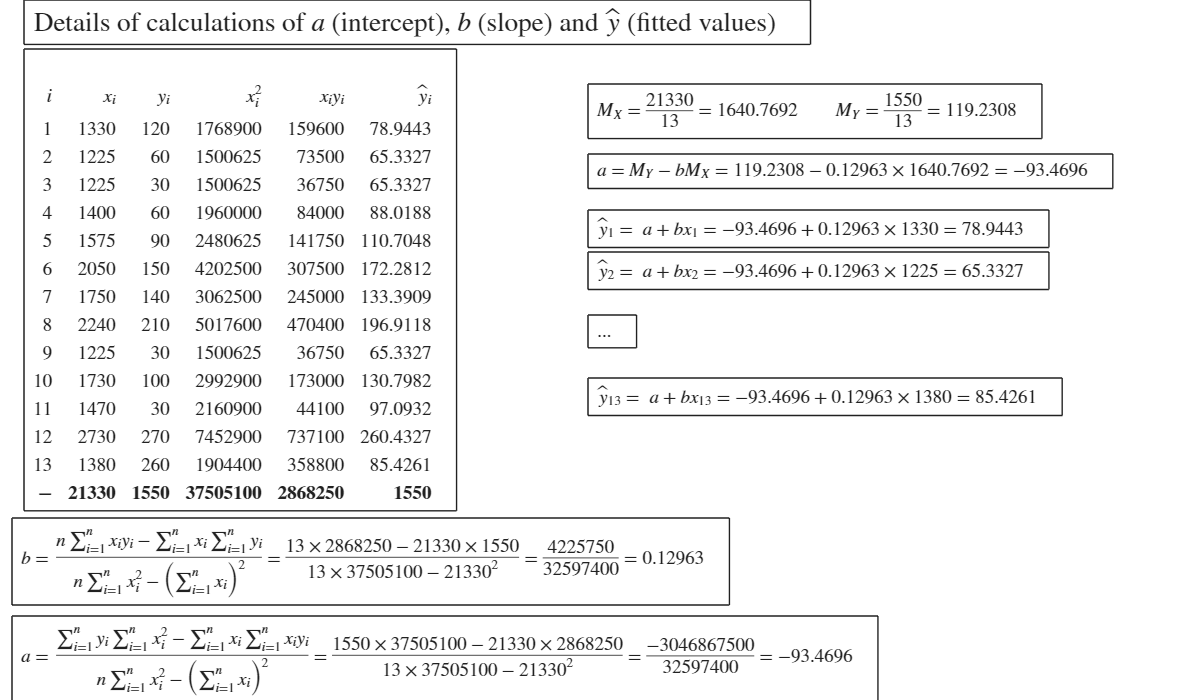 Calculation of unweighted regression.In this example we know the monthly income of 13 families and we estimate the correlation with the free time expenditure. (See page 223 of [MRZ]).