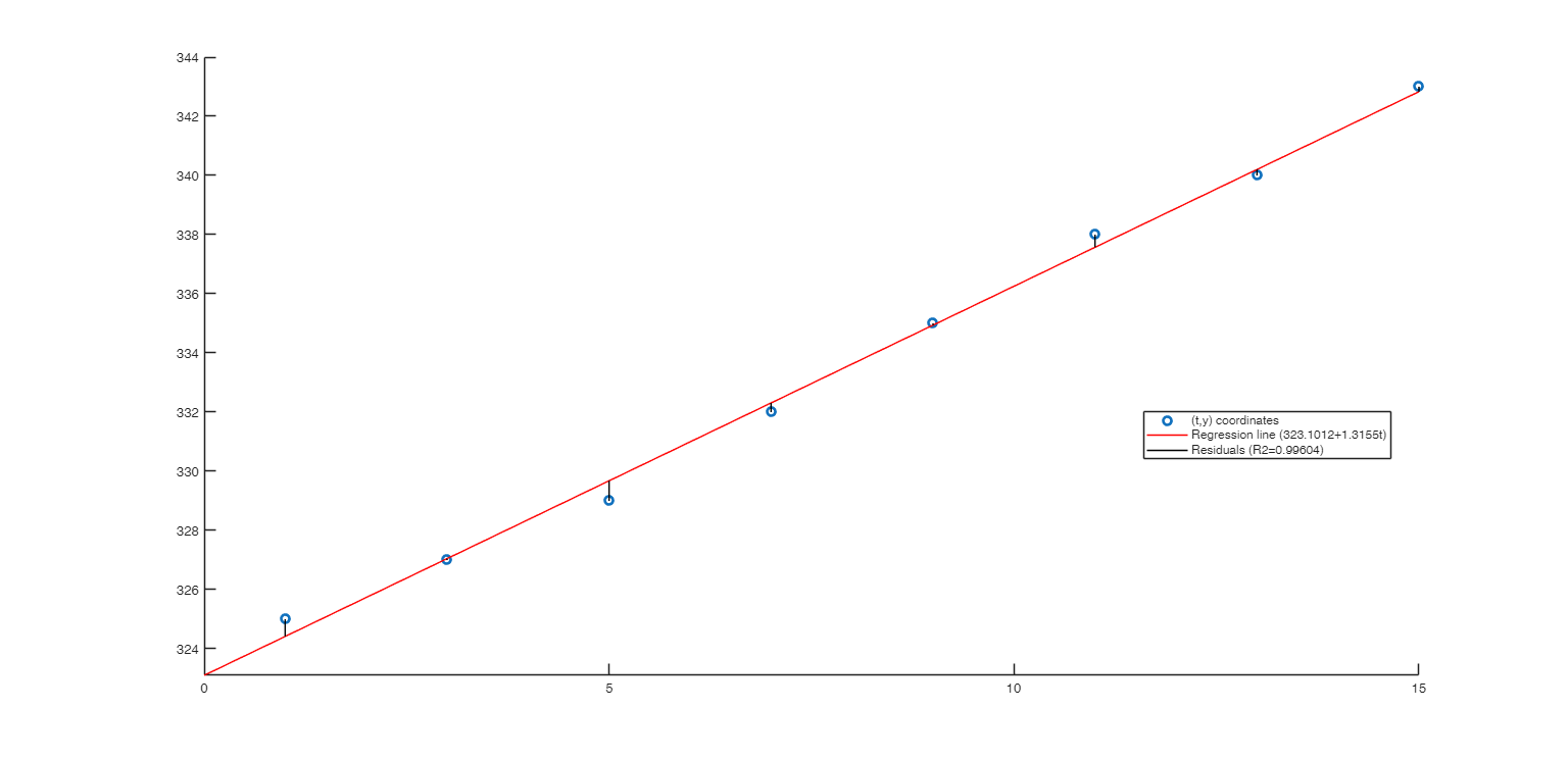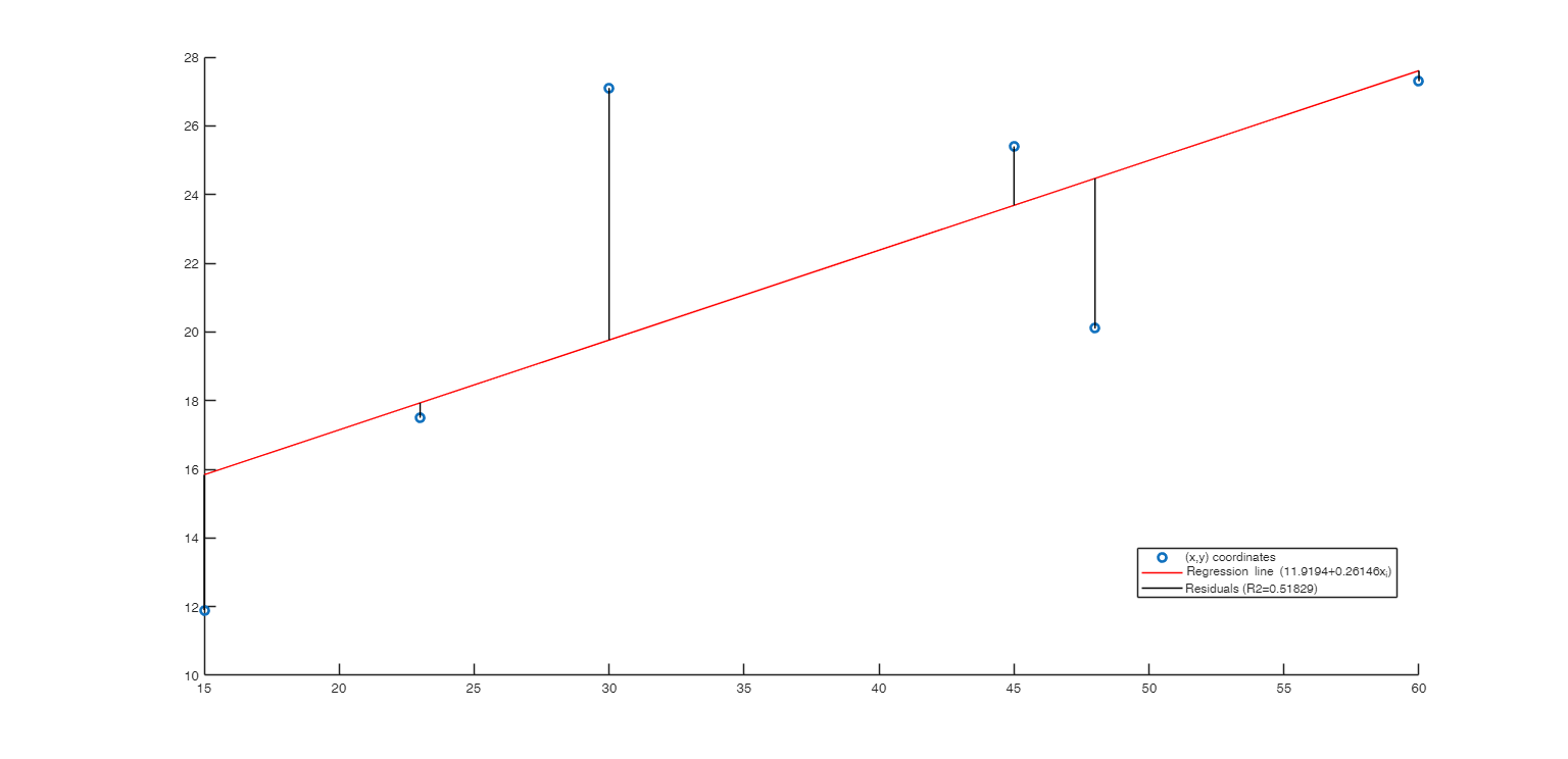 x=[60 48 45 30 23 15]; y=[27.3 20.1 25.4 27.1 17.5 11.9]; out=GUIregress(x,y,'plots',true);