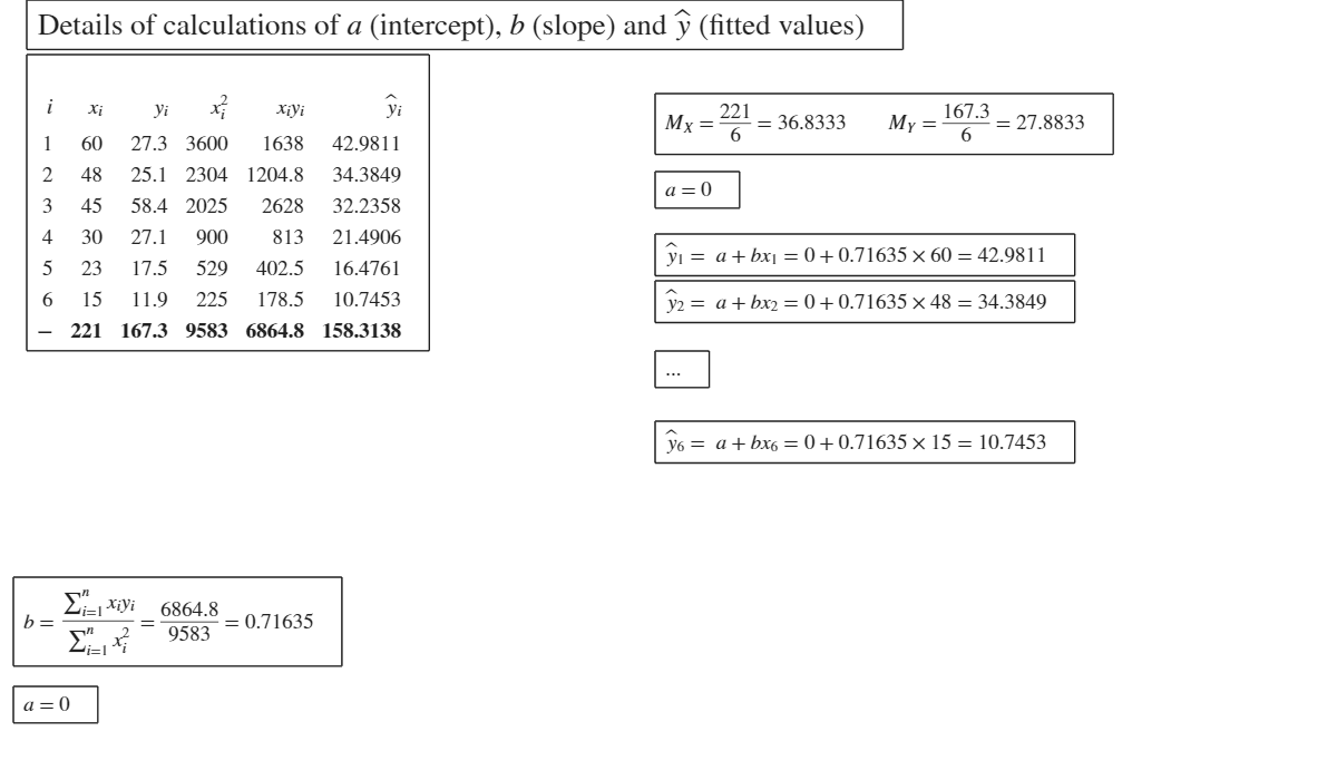 x=[60 48 45 30 23 15]; y=[27.3 25.1 58.4 27.1 17.5 11.9]; out=GUIregress(x,y,'intercept',false,'plots',false);