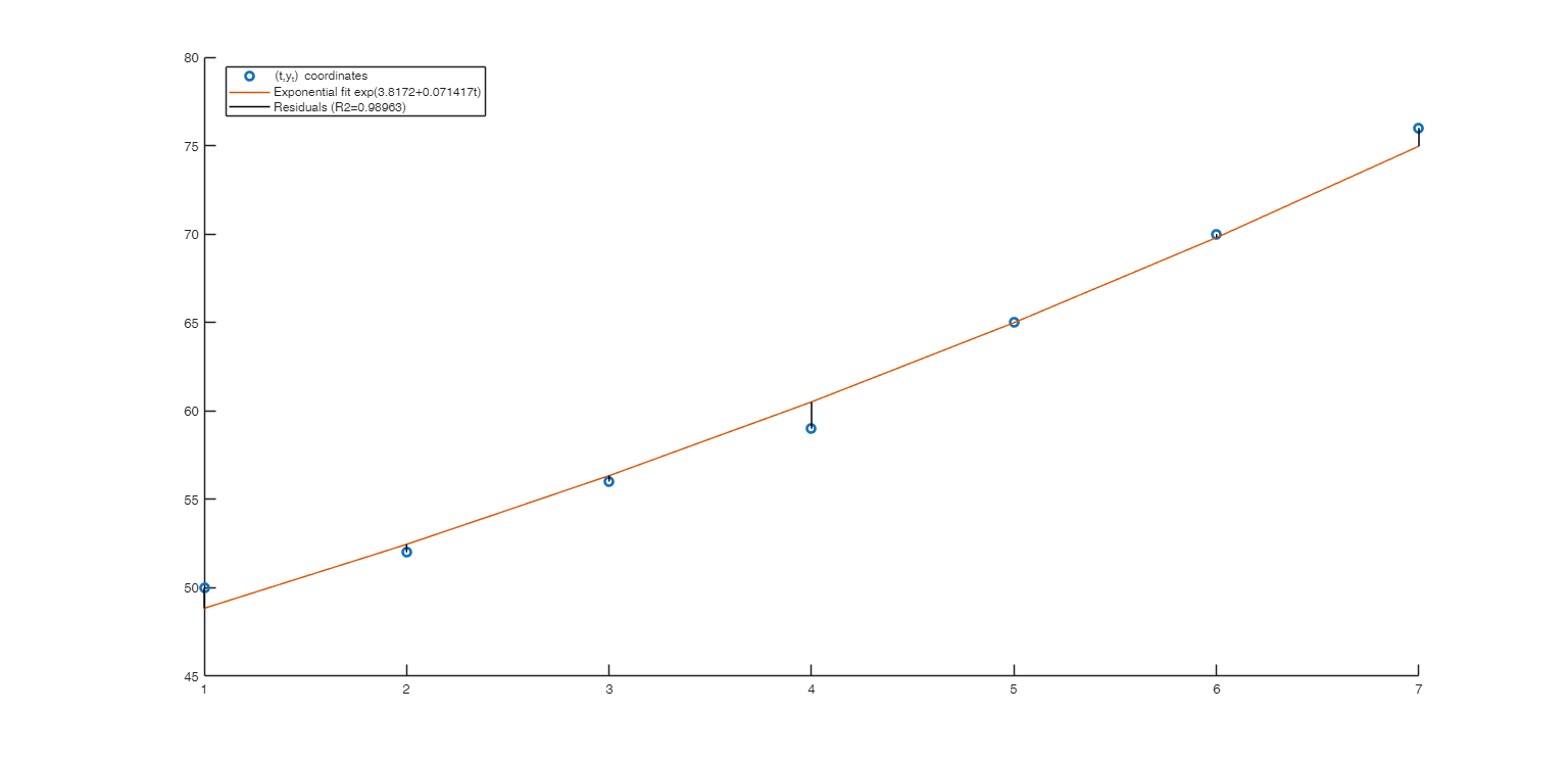 x=1:7; y=[50 52 56 59 65 70 76]; % Analyze the trend of the company's production using an exponential fit. out=GUIregress([],y,'interpolant','exponential','plots',true,'timeseries', true);
