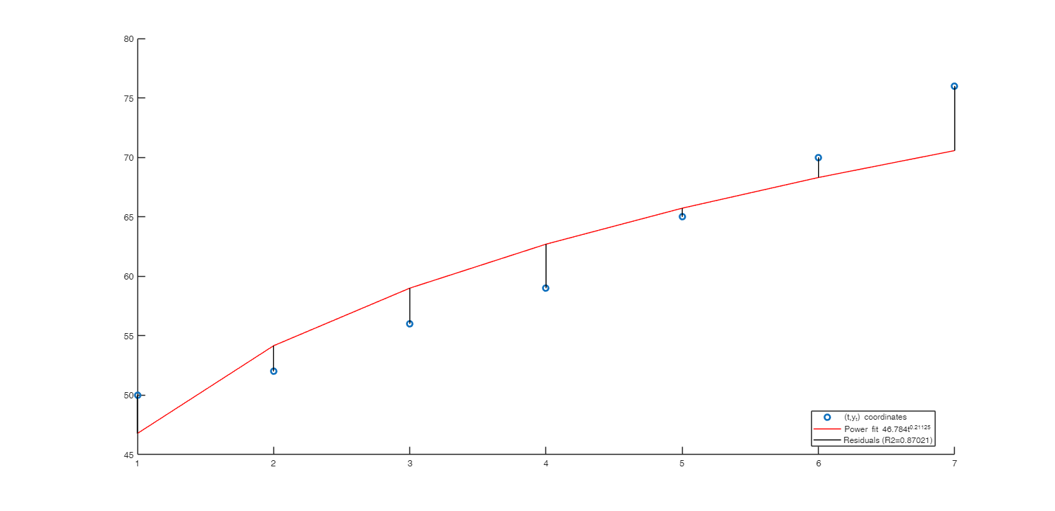 x=1:7; y=[50 52 56 59 65 70 76]; % Analyze the trend of the company's production using a power fit. out=GUIregress(x,y,'interpolant','power','plots',true,'timeseries', true);