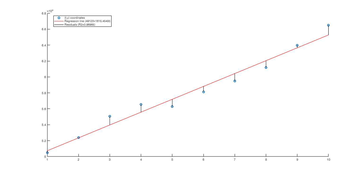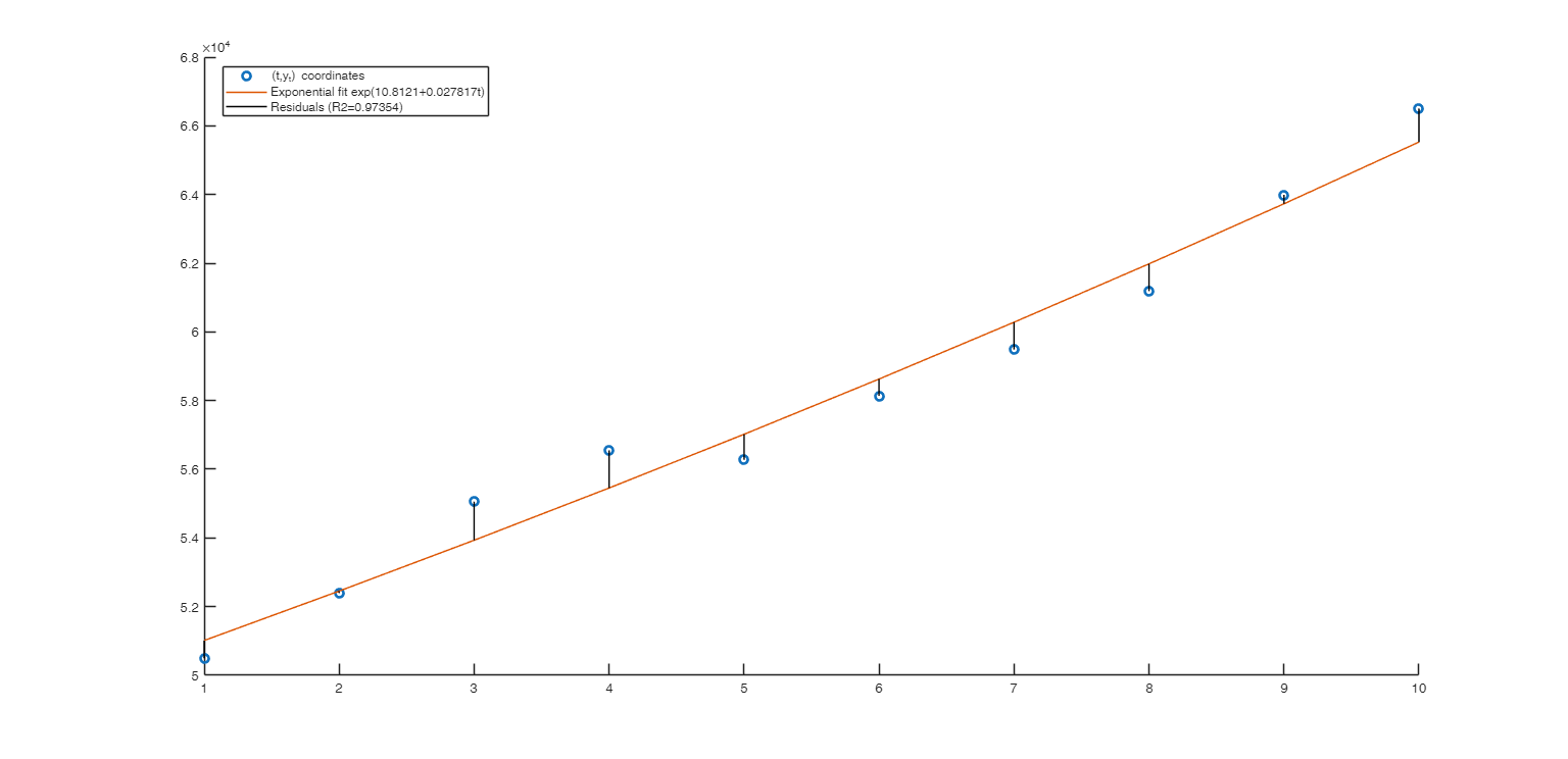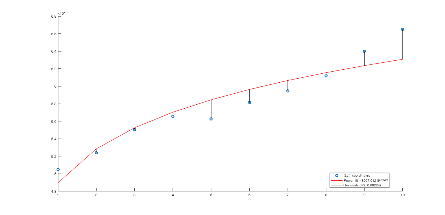 y=[50496 52396 55058 56550 56275 58138 59485 61188 63989 66505]; x=1:10; % Analyze the trend of the company's production using a linear fit. out=GUIregress(x,y,'interpolant','linear','plots',true, 'timeseries', true); % Analyze the trend of the company's production using an exponential fit. out=GUIregress(x,y,'interpolant','exponential','plots',true,'timeseries',true); % Analyze the trend of the company's production using an power fit. out=GUIregress(x,y,'interpolant','power','plots',true,'timeseries',true)