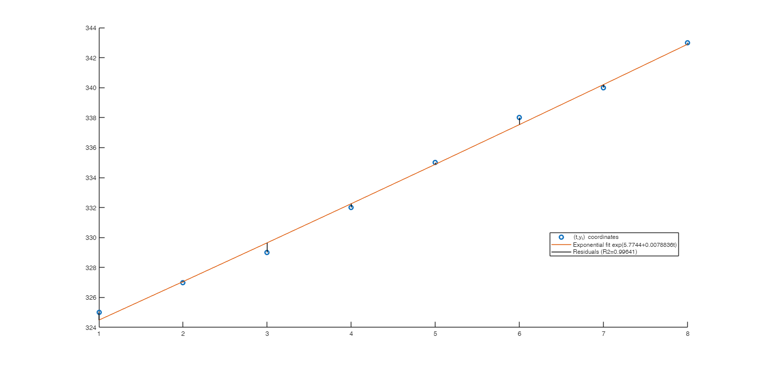 Legend ((t,y_t) coordinates, Exponential fit exp(5.7744+0.00…) with properties: