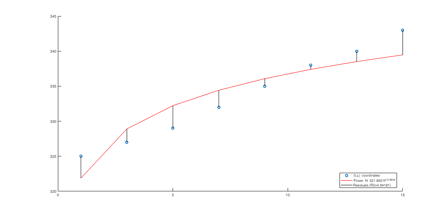 Legend ((t,y_t) coordinates, Power fit 321.8821t^{0.019649},…) with properties: