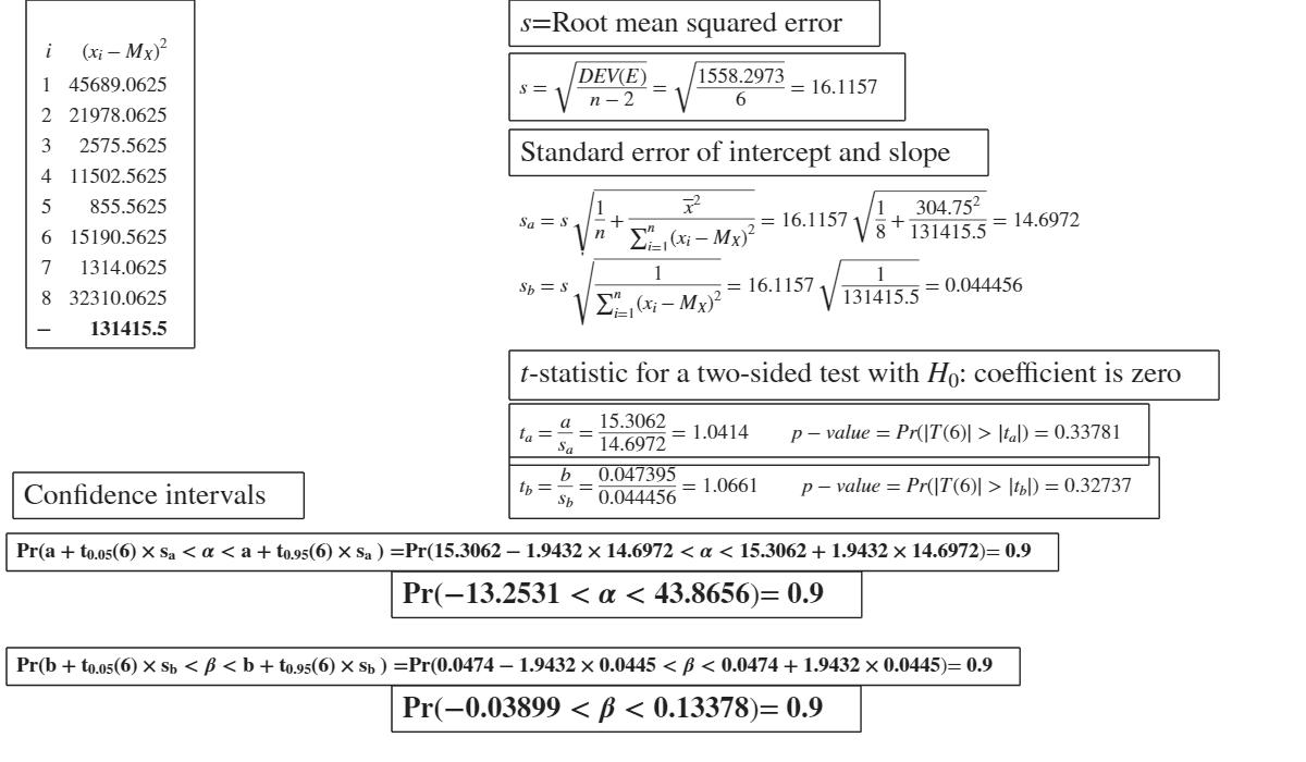 x=[91 453 254 412 334 428 341 125]; y=[13 12 17 56 29 35 49 27]; out=GUIregress(x,y,'inferential',0.90,'plots',false); % There is not enough evidence to state that is not 0 in the population % and the estimated relationship between the two variables is % significant. The value of the linear index of determination % (R2=0.159) shows a very poor fit of the regression line. The % estimated model is therefore of no use for interpreting the causes of % pollution.
