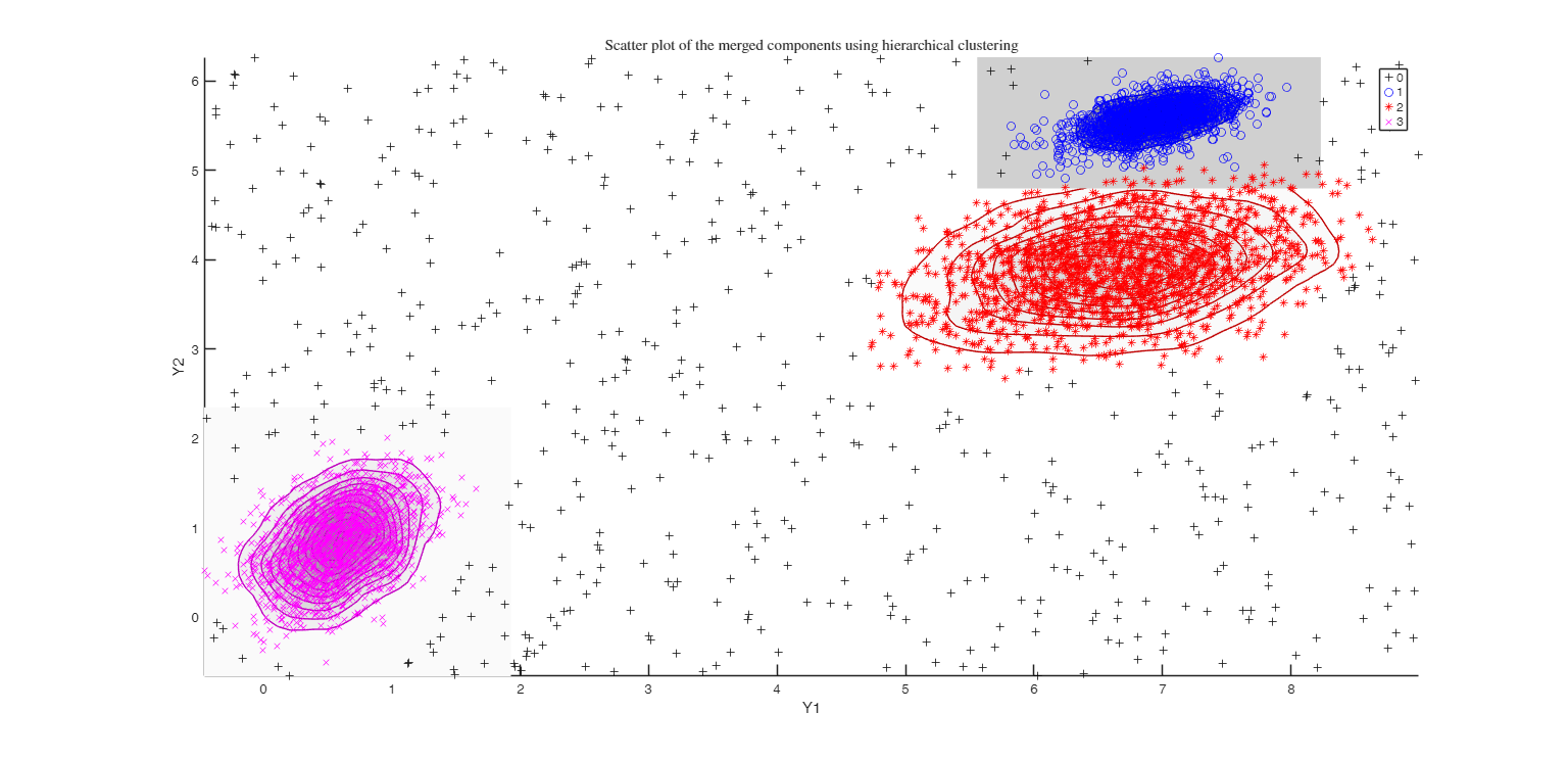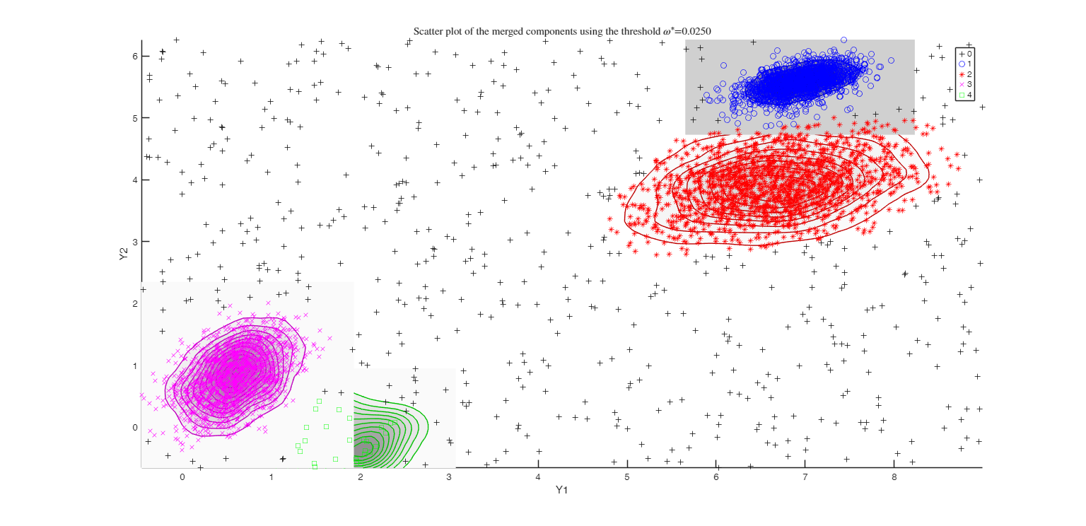 DEMP2 = dempk(X, k*5, g, 'plots', 'contour');Total estimated time to complete trimmed k means: 9.90 seconds ------------------------------ Warning: Number of subsets without convergence equal to 36.6667% Total estimated time to complete trimmed k means: 0.85 seconds ------------------------------ Warning: Number of subsets without convergence equal to 38.6667%