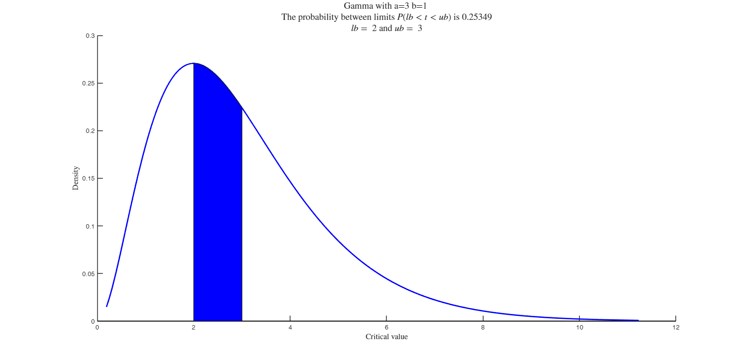 distribspec generalises the MATLAB function normspec for plotting a selected probability density function by shading the portion inside or outside given limits.