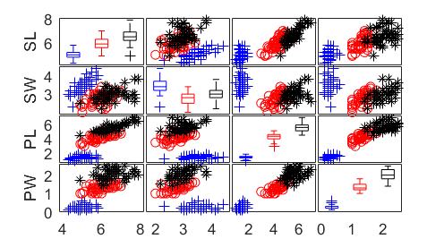 Scatter plot matrices with groups and boxplots on the main diagonal