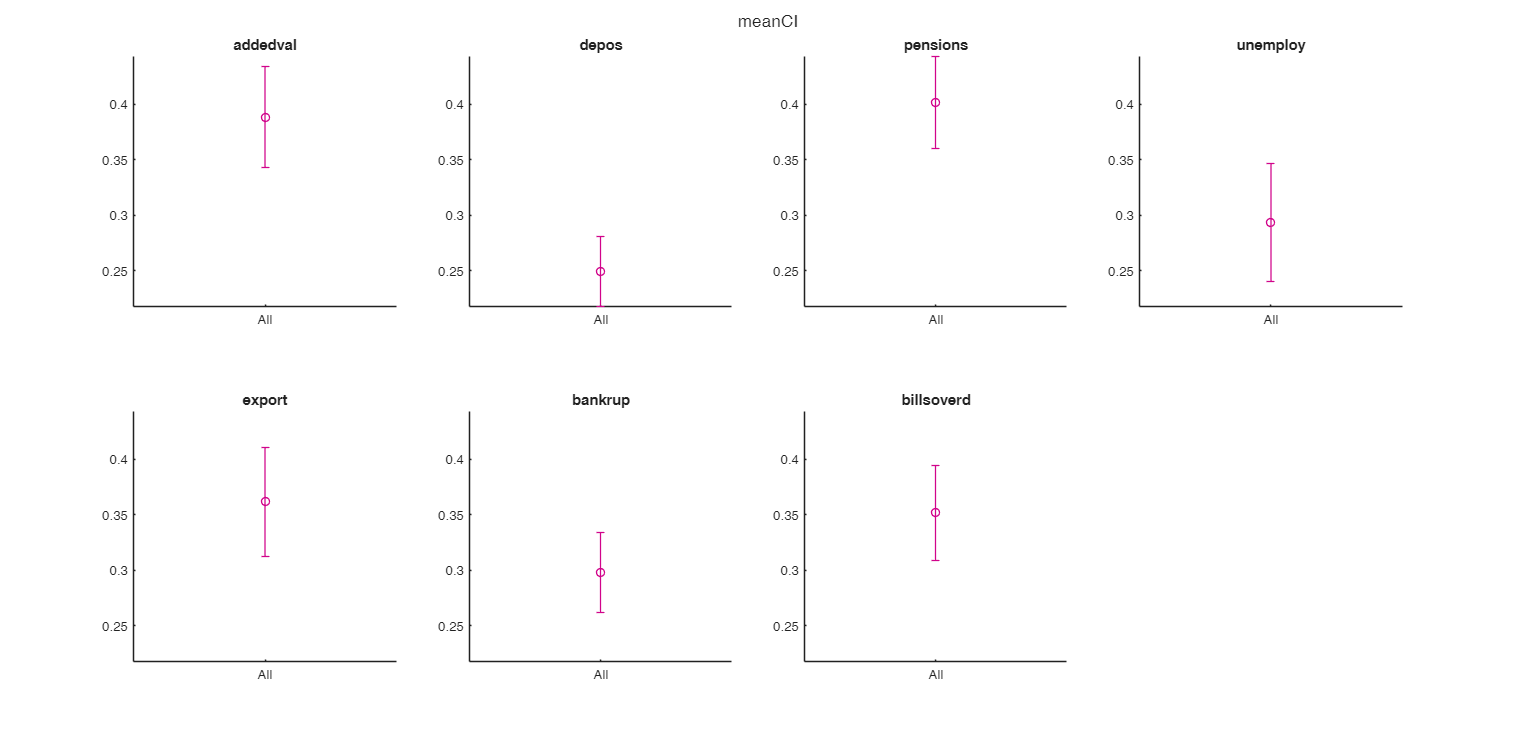 —graphical output using errorbar plot.scalar | struct This option enables to show the errorbar plot of the required statistics (for each level of the grouping variable if the grouping variable is present).When plots=1, if inside option whichstats there is meanci the errorplot which shows the confidence interval for each level of the grouping variables for all variable present in the input table is shown. If inside whichstats meanci is not present the errorplot is based on the first element of whichstats. If plots is a struct it is possible to specify inside field plots.selStats the statistics for which the plot has to be shown. For example if whichstats is equal to ["mean" "var" "meanci"] and plots=struct;