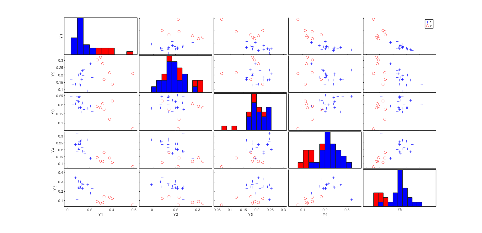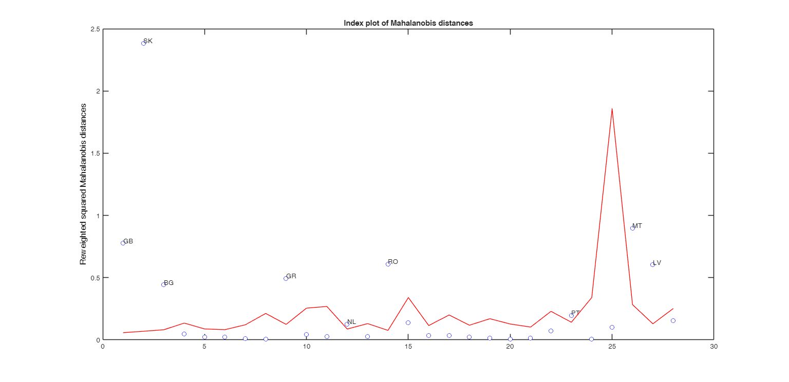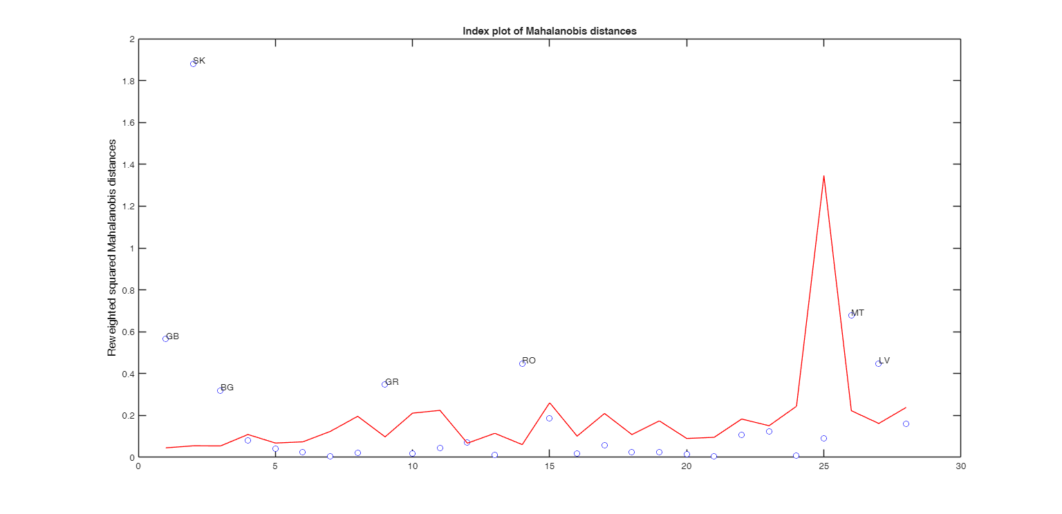 —Plot on the screen.scalar | structure.If plots is a structure or scalar equal to 1, generates: (1) a plot of Mahalanobis distances against index number. The confidence level used to draw the confidence bands for the MD is given by the input option conflev. If conflev is not specified a nominal 0.975 confidence interval will be used.
