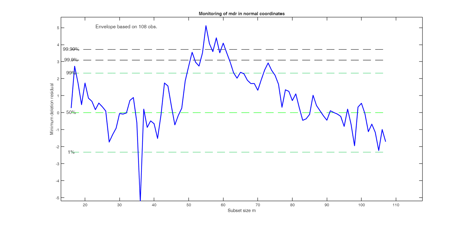mdrplot(out,'sign',1);In this case the resuperimposed envelope is based on n-2 observations