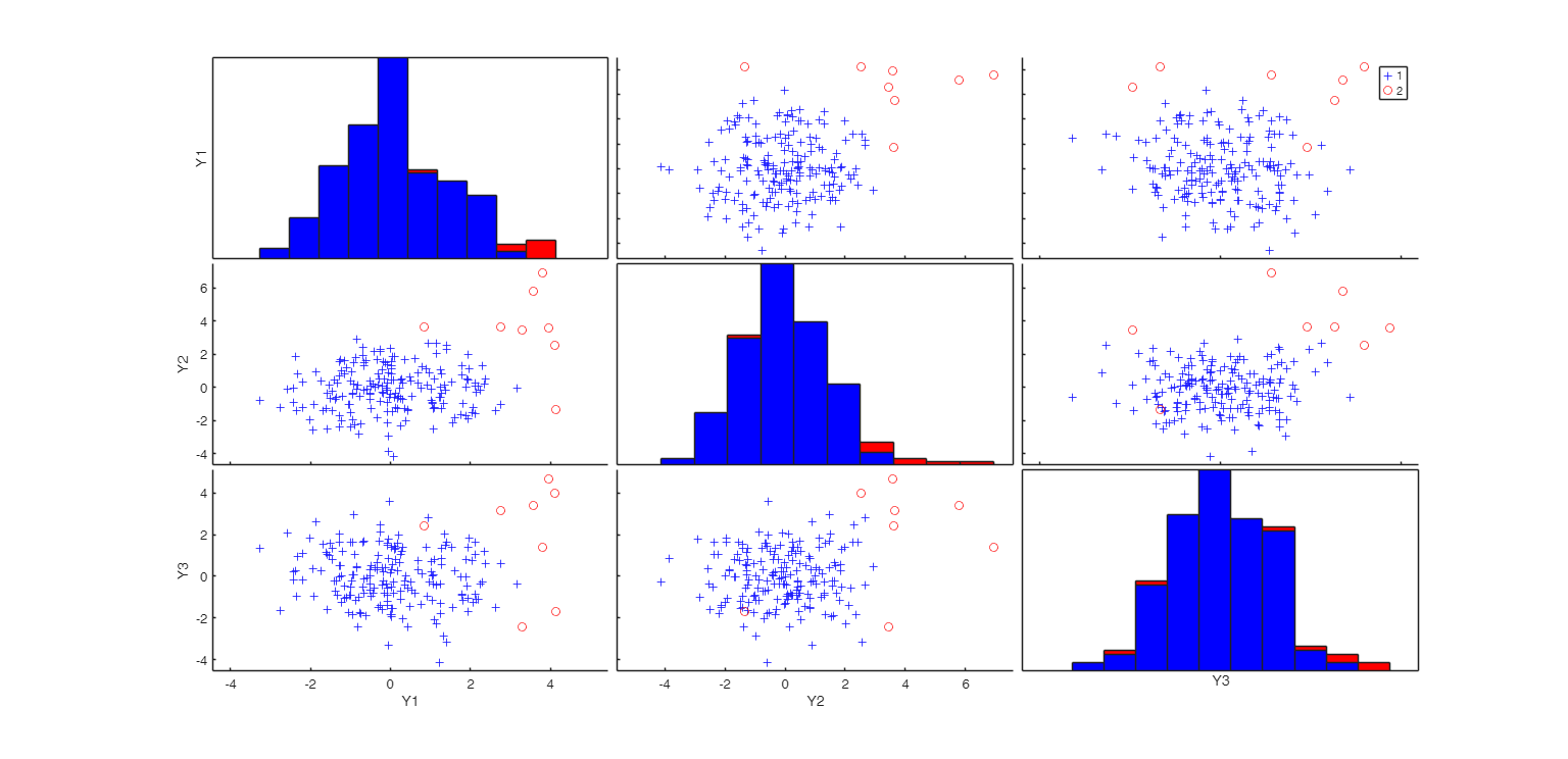 —Plot on the screen.scalar | structure.If plots is a structure or scalar equal to 1, generates: (1) a plot of Mahalanobis distances against index number. The confidence level used to draw the confidence bands for the MD is given by the input option conflev. If conflev is not specified a nominal 0.975 confidence interval will be used.