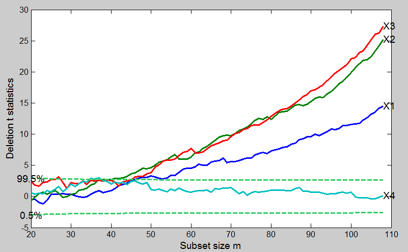 These curves behave as we would hope: initially no variable is significant, although x3 is briefly significant at the 1% level around m=20. The curves then rise smoothly to their values when m=n, with the nonsignificant value of t4 showing seemingly random fluctuations.
