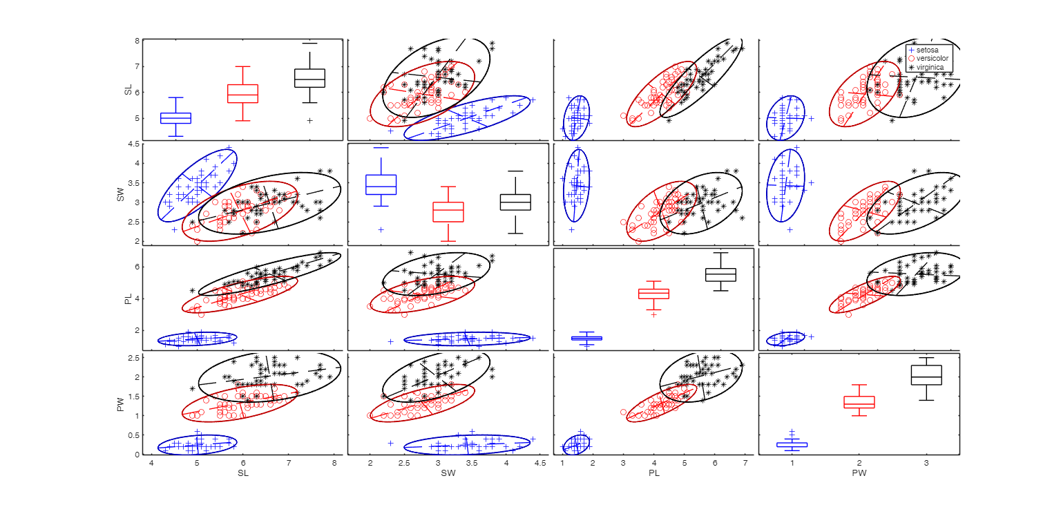 plo.nameY={'SL','SW','PL','PW'}; % Name of the variables