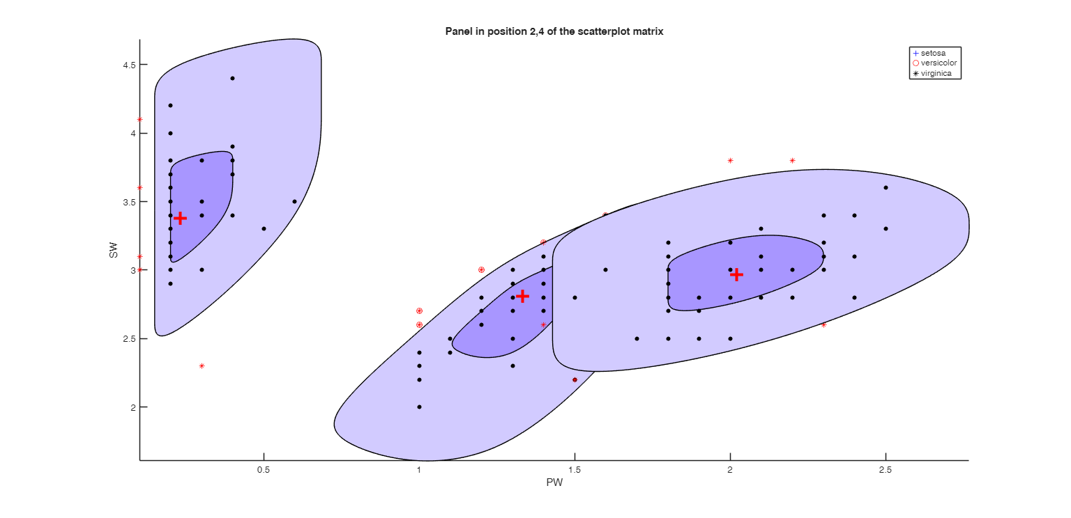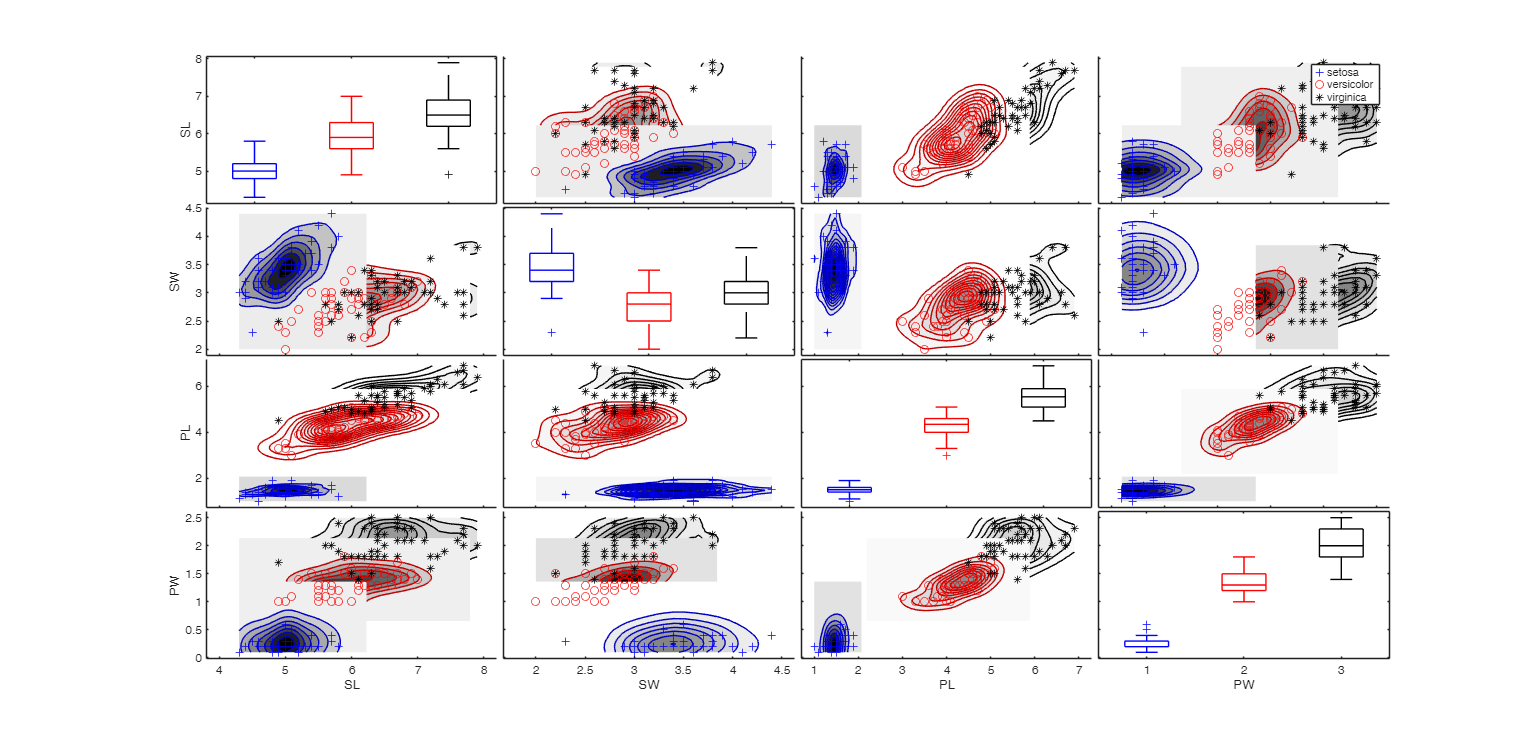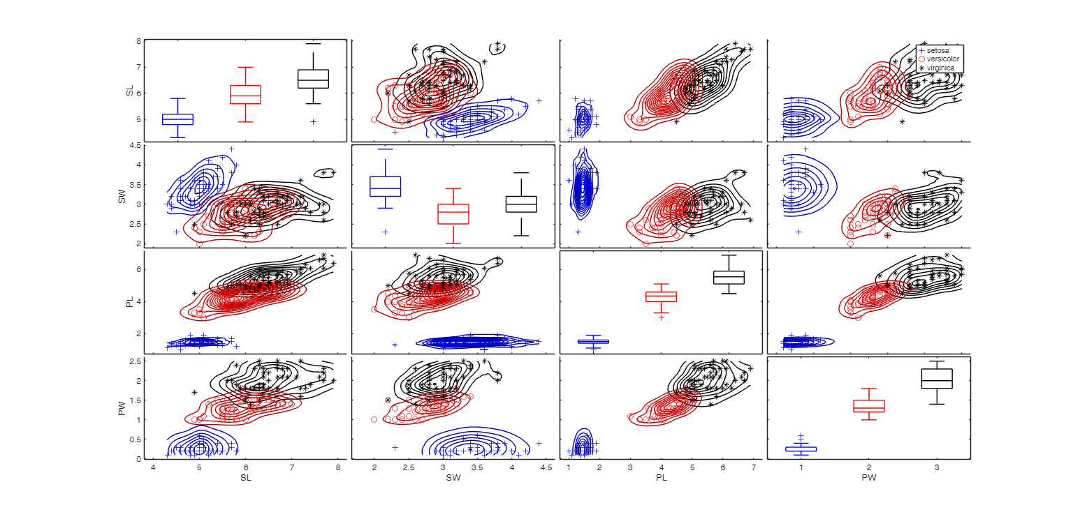 spmplot(meas,'group',species,'plo',plo,'dispopt','box','overlay','contourf');