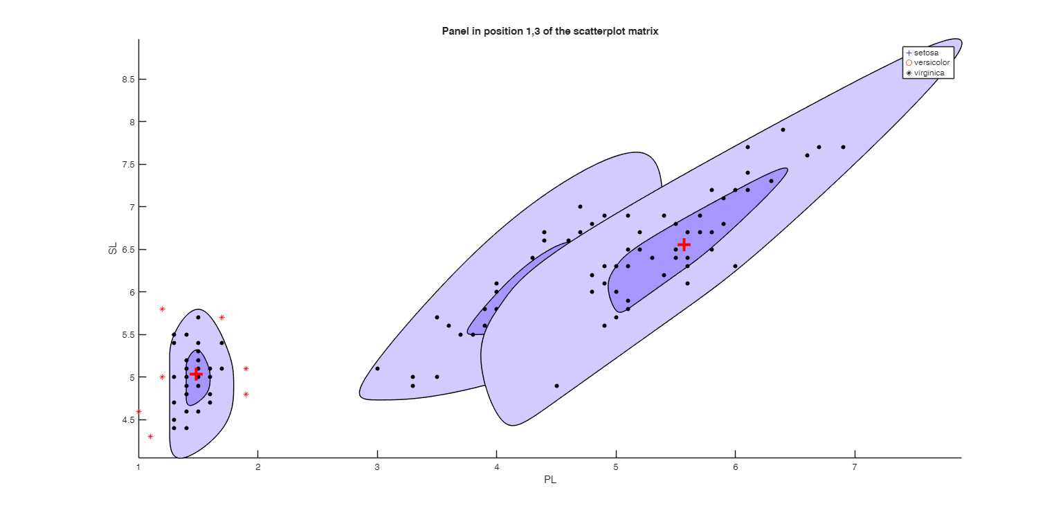 spmplot(meas,'group',species,'plo',plo,'dispopt','box','overlay','ellipse');