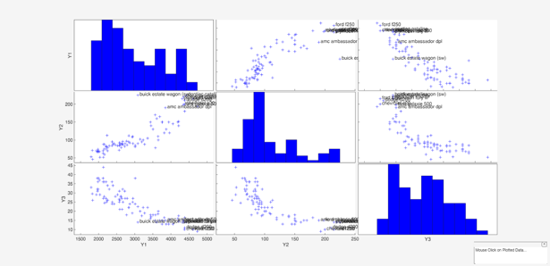 "none" just the upper part of the scatter plot matrix is shown. The fields of the struct can either be characters or strings. typespm='lower' is equivalent to typespm=struct; typespm.lower='scatter', typespm.upper='number'; |