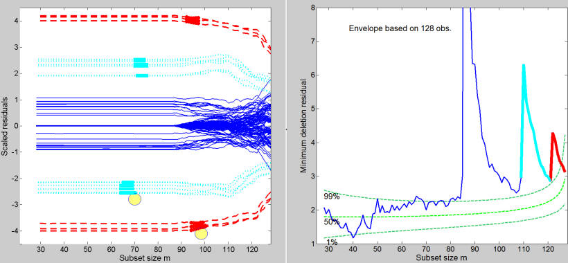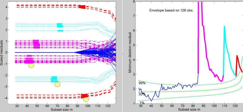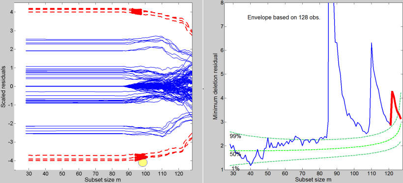 These plots are static in the sense that do not enable for example to understand from which units the 3 peaks, which clearly appear in the minimum deletion residual plot, are formed. Similarly, it is not clear which trajectories of the residuals correspond to the three peaks. So far all this information had to be checked manually analyzing the units which entered the search. At present, thanks to the interactive connection which we have created among the different plots it is possible to select a set of trajectories in the monitoring residuals plot and at the same time to see them highlighted in the monitoring of the minimum deletion residual using the option databrush and sub option persist.
