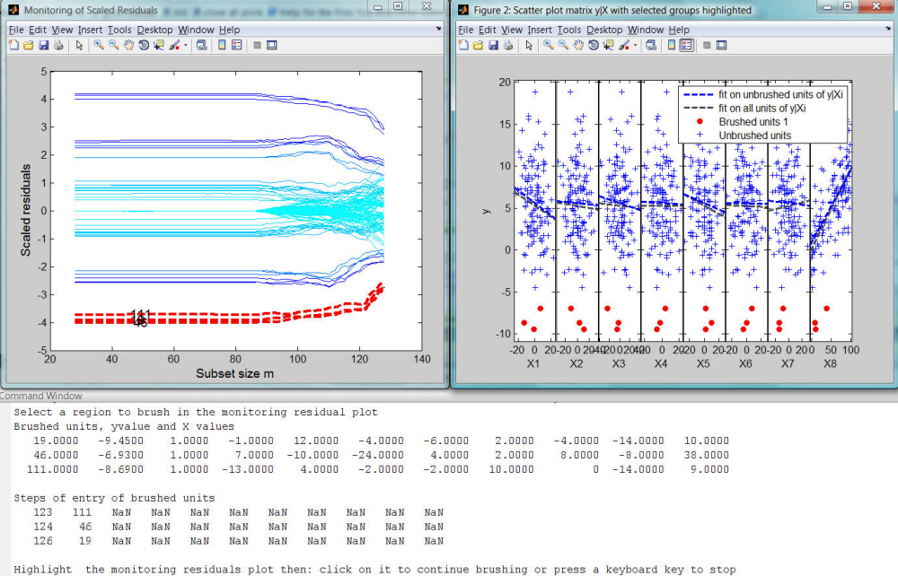 databrush=struct; databrush.bivarfit='2'; databrush.selectionmode='Brush'; % Brush selection databrush.persist='on'; % Enable repeated mouse selections resfwdplot(out,'databrush',databrush);once a set of trajectories in the monitoring residuals plot is brushed, enables the user to superimpose in the scatter plot matrix, which opens automatically, the projected regression line with and without the brushed units. Finally, in the command window, it is also possible to have the information about the units which are brushed and their order of entry into the forward procedure.