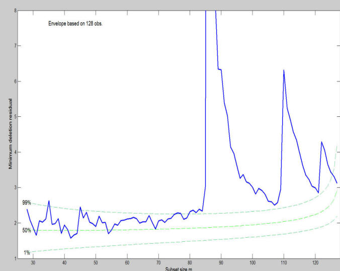 The plot of minimum deletion residual among observations not in the subset, shows three clear peaks (see Figure below)