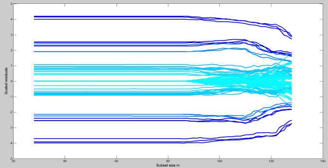The monitoring of scaled residuals clearly shows that there is a lot of interchange in the order of magnitude of the residuals during the forward search.