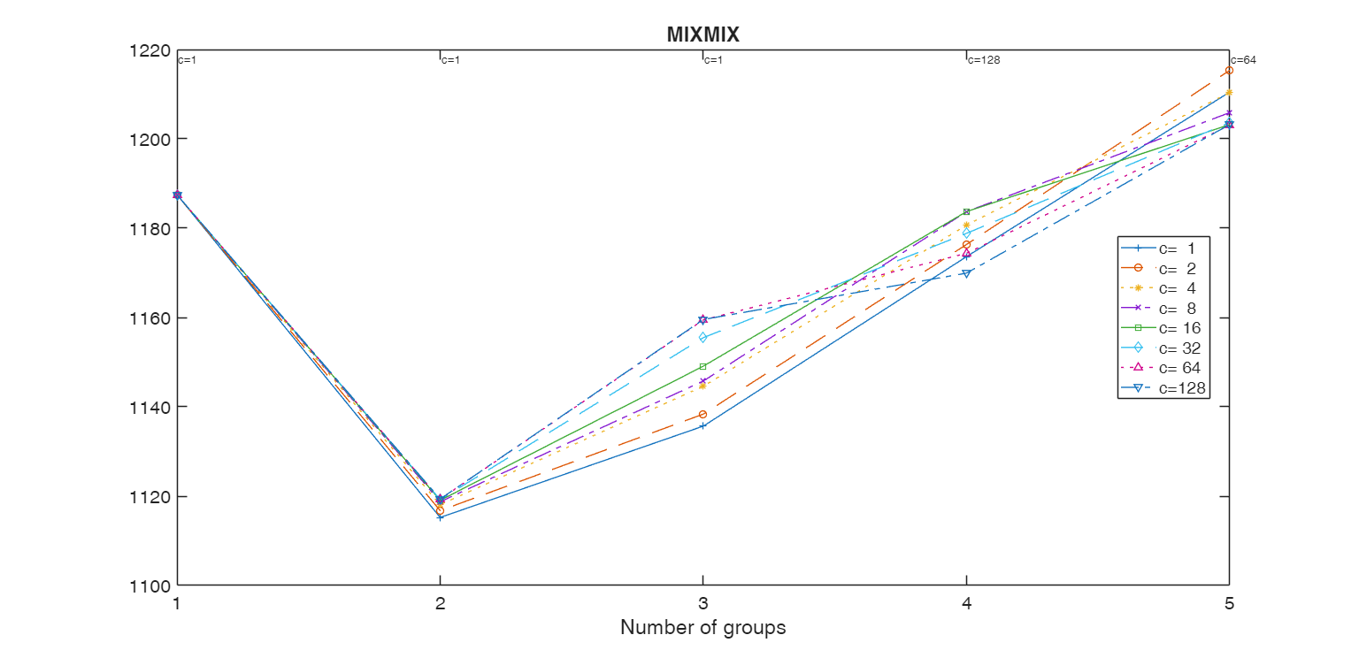 tclustICplot(out,'whichIC','MIXMIX');k=1 k=2 k=3 k=4 k=5 The labels of c in the top part of the plot denote the values of c for which IC is minimum