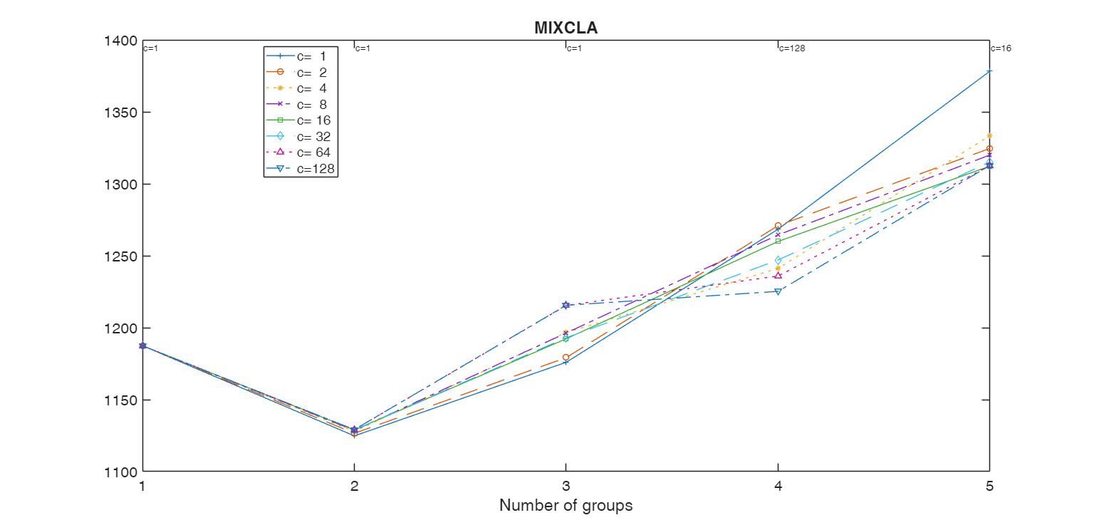 cell of size 5-times-8 if kk and cc are not specififed else it is a cell of size length(kk)-times length(cc). Each element of the cell is a vector of length n containinig the assignment of each unit using the mixture model. This output is present only if 'whichIC' is 'MIXMIX', 'MIXCLA' or 'ALL'. |